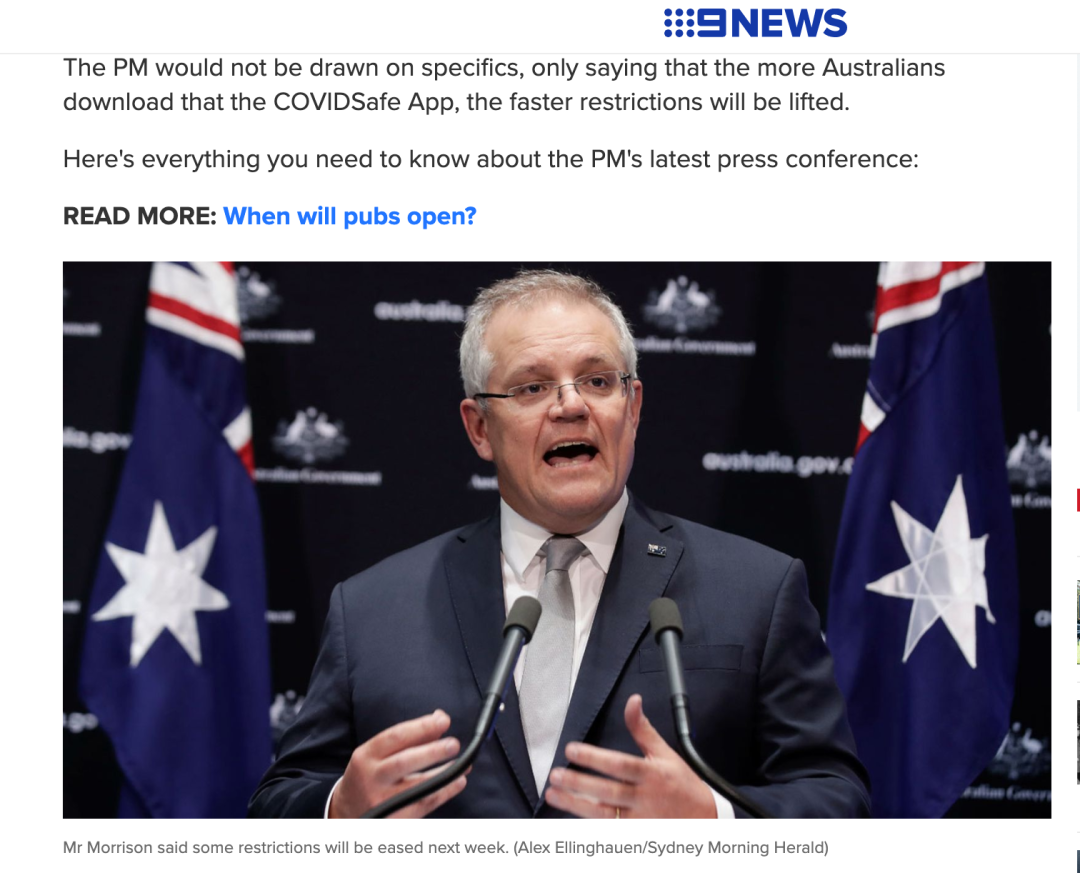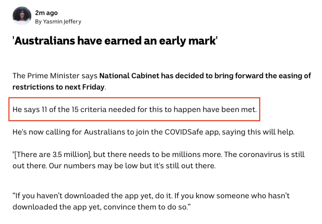 莫里森说:澳大利亚现在已经达到了AHPPC设定的15条解除限制条件中的11条。这些条件之一就是下载CovidSAFE应用程序。